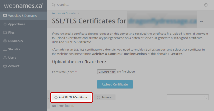 - Click the Add SSL/TLS Certificate button.