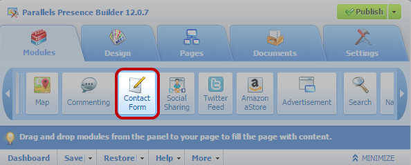 - Go to the Modules tab, select Contact Form, (found on the 2nd page of modules to the right) and drag the module to the page.