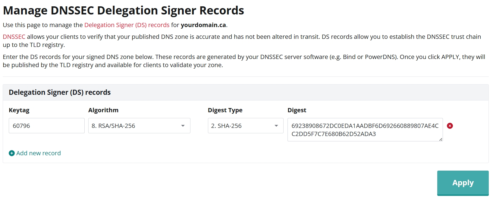 These records must then be uploaded to the domain's respective domain registry, which for domains registered with Webnames.ca, via your Webnames.ca account. See the next section for instructions