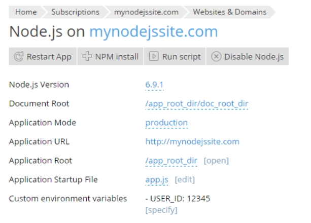 To set your application up, go to Websites & Domains and click Node.js. On this screen you can see a number of controls that will help you manage your Node.js application: