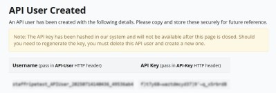 - Note the Username and API Key values (which are only displayed once before being one-way hashed).